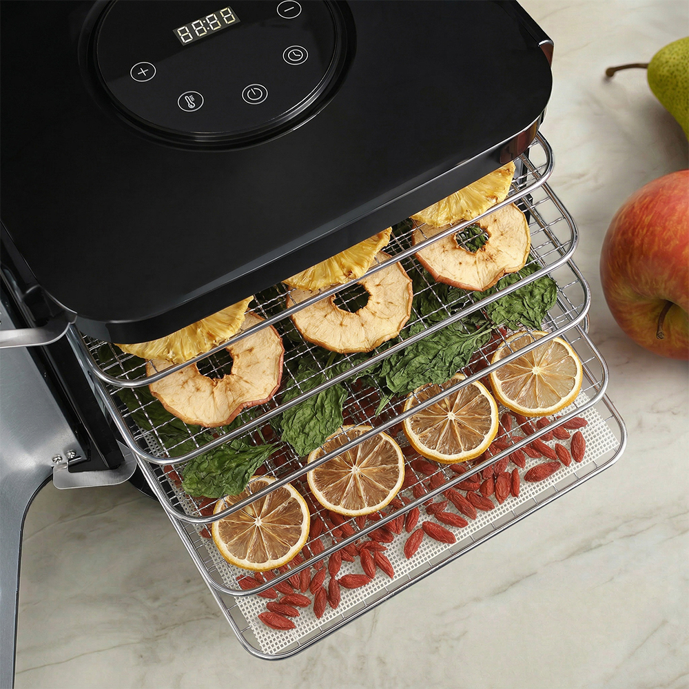 Внутри установлены пять прочных поддонов из нержавеющей стали. Они не впитывают запахи, легко моются и подходят для регулярного использования. В комплект также входит специальный поддон для пастилы, чтобы готовить фруктовые рулеты и ягодные пласты без пергамента.