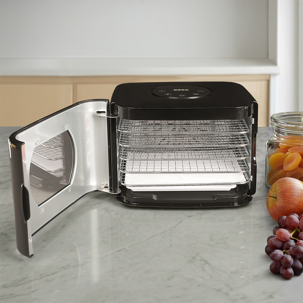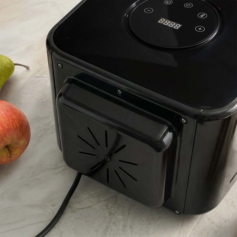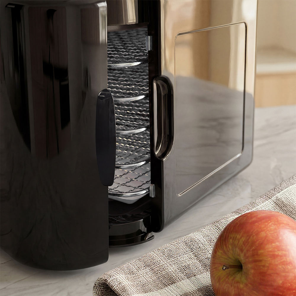 Корпус из прочного пластика черного цвета выглядит аккуратно и легко вписывается в современную кухню. Дверца оснащена стеклом, чтобы наблюдать за процессом сушки, не открывая камеру и не нарушая температурный режим. Благодаря этому сохраняются стабильные условия внутри и продукты равномерно готовятся на всех уровнях.