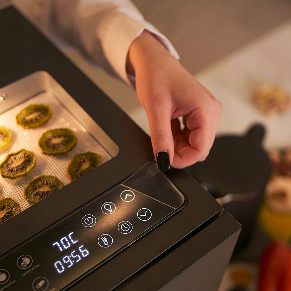 Чёрный корпус из нержавеющей стали, устойчивый к нагреву, влаге и коррозии, выглядит лаконично и современно, легко вписывается в интерьер кухни или мастерской. Внутри установлено 8 поддонов из нержавеющей стали с зазором 25 мм — этого достаточно, чтобы удобно размещать ломтики фруктов, травы или мясные полоски.