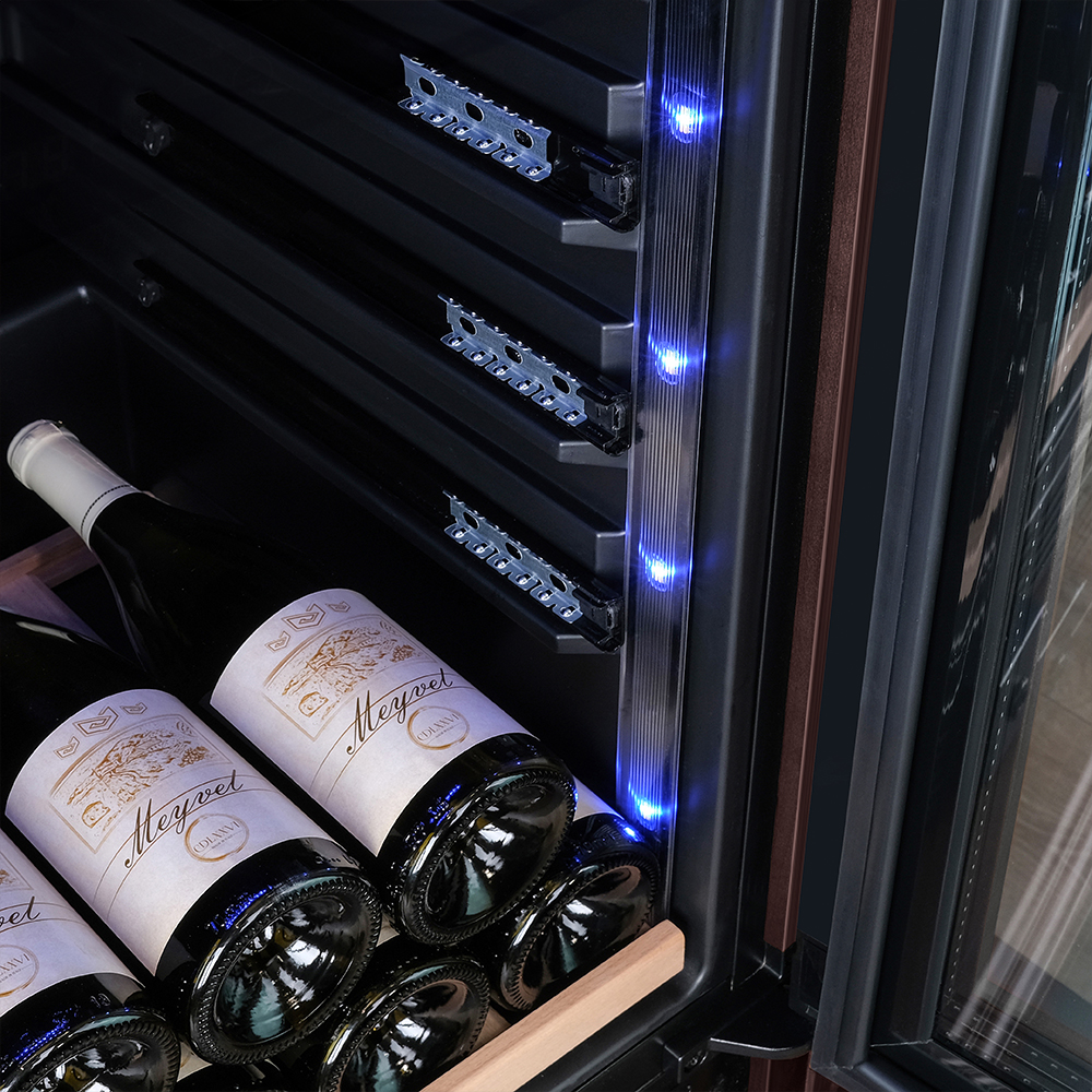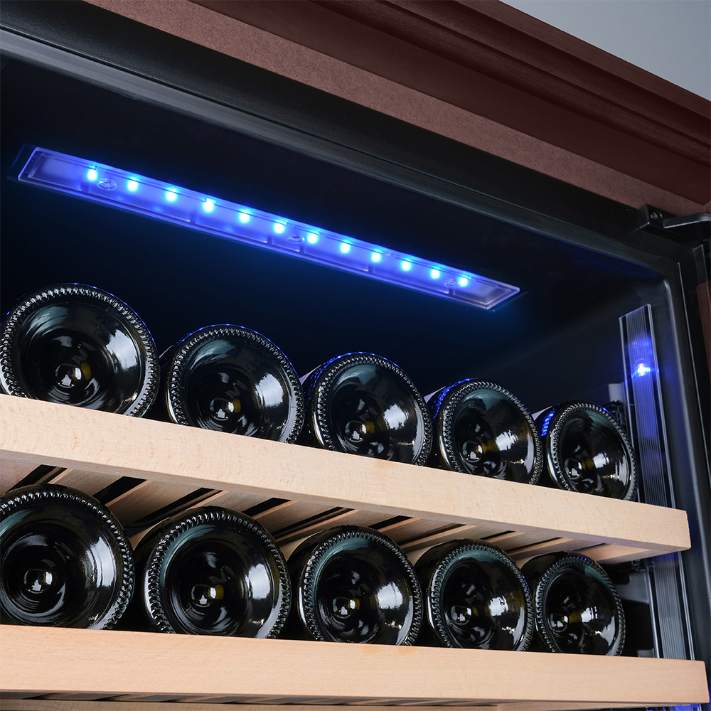 Несомненно, Вас порадует наличие панорамного светодиодного освещения (подсвечивает каждую полку), которое имеет три цвета - белый, янтарный и синий. Оно не выделяет тепло и следовательно - не нагревает бутылки с вином. Так что Вы сможете эффектно демонстрировать Вашу винную коллекцию.