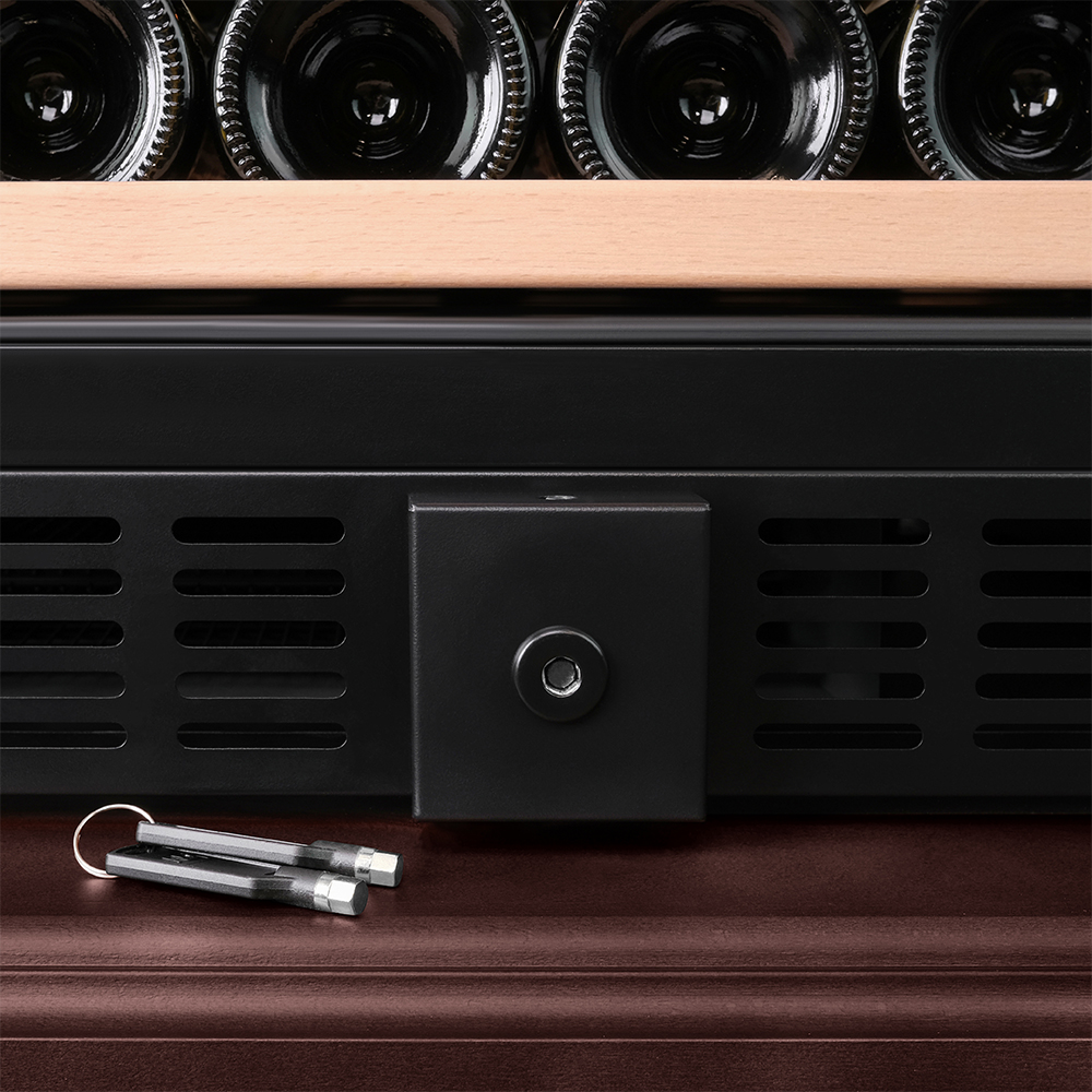 Винный холодильник оснащён надёжным и экономичным компрессором. Есть ручка, вентиляционная решётка и замок.